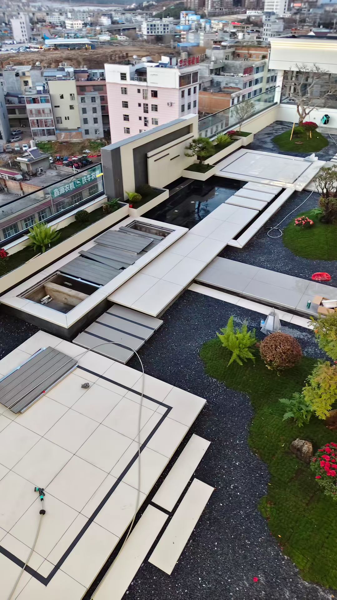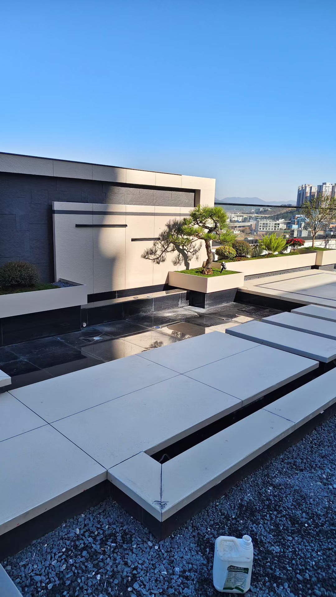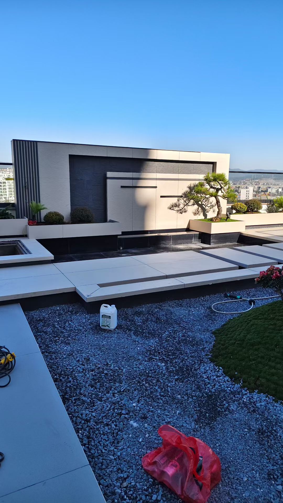 整体色调以米白、深灰为主基调,搭配层次丰富的绿植与温润的木质元素,既呼应了建筑的现代风格,又注入了自然的生机。我们充分利用楼顶 360° 的城市视野,将远处的城市天际线纳入庭院景观,实现 “人在园中,景在城中” 的沉浸式体验。同时,针对楼顶花园承重有限、风大暴晒、防水要求高等痛点,我们在设计与施工阶段做了全面的专项优化,确保庭院的安全性与耐久性。